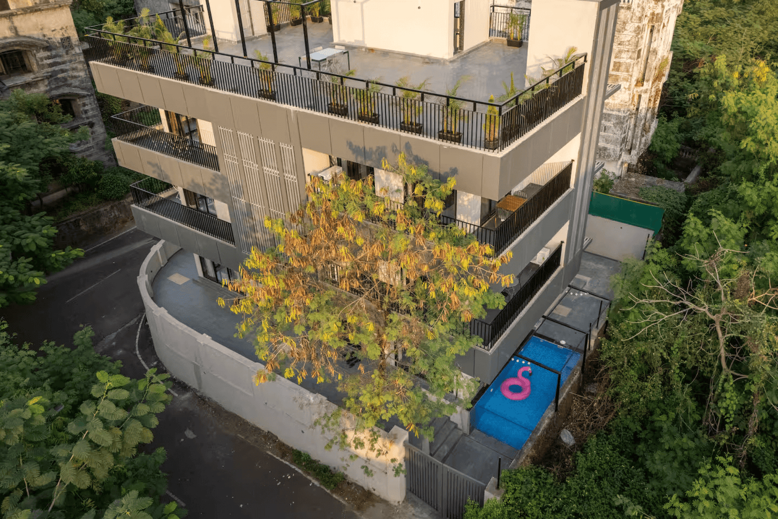 This property is a big 8bhk split into 2 separate 4 bhks one part having access to the pool and the terrace and the other part not having access to these. Both parts are connected only by the hall which if is booked by 2 separate groups the partition remains shut.
